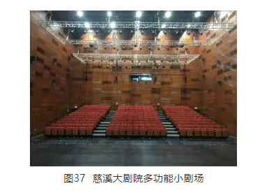慈溪大剧院多功能小剧场由浙江大学声学研究所负责建筑声学设计,场地顶面采用全开放形式,排布了用于吊挂各种扬声器、灯光设备的桁架,墙面采用面块板作纵横经纬的分割,内衬吸声棉,建声条件较好,厅堂固有中频(500 Hz)混响时间的最终测量结果为1 s。此项目的电子声学环境可变系统也选用了E-Coustic系统,因为整个空间为全开放式,所以,榴莲视频下载污和观众席做了一体的声学优化设计。整套系统总共使用了4支传声器和54只扬声器,传声器选型与上述威海群艺馆海洋剧场案例相同,分别吊装于榴莲视频下载污前方和中部的上空,以拾取榴莲视频下载污任意位置的声源。榴莲视频下载污电子反声罩系统共使用了23只扬声器,观众席则共安装了31只扬声器,其中包括天花吊挂的6只超低扬声器,所有扬声器均采用明装方式,如图37所示。