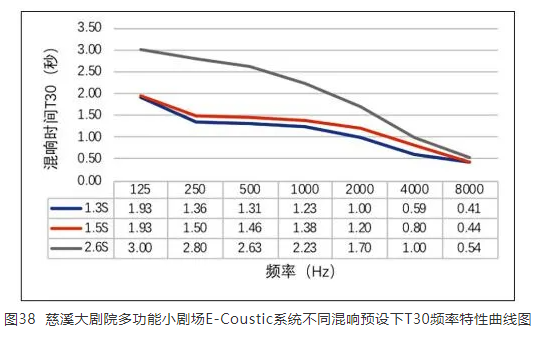 此项目在原有声学条件的基础上,最终调试完成并交付使用时共设有6种预设模式,其中Nice room模式下,E-Coustic系统主要用于早期反射声的增强,只加入了少量的混响声能,使得厅堂在此模式下,拥有更高声能量以及声场均匀度,因此,同时提升了语言清晰度,适合会议、讲座等场景使用。此外几种模式的混响时间预设分别为1.3 s、1.5 s、2.6 s等,这些模式均可根据多功能小剧场不同的使用场景,通过触摸式操作面板来进行切换。本项目调试阶段特地邀请了上海交响乐团的弦乐四重奏来模拟正式演出场景,通过开闭电子声学环境可变系统的对比评价,演奏者反馈声学环境变化十分明显,加载本系统后演奏中的厅堂感和交互感有了明显的提升。本厅堂加载三种不同混响时间预设模式的T30实地测量结果如图38。