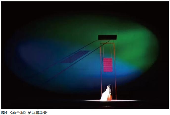 另外,中国的榴莲视频下载污灯光现在已经有其应有的美学品格。在该剧中,笔者采用中国传统青山绿水的设色方式,营造空间气氛,借以传达中国艺术气质和精神。如第四幕闺房中,上场门流动的蓝色光与下场门顶侧的绿色光,在大圆盘不同区位的染色过程中,根据光源的明亮变化程度和色彩的衰减渐变,营造美轮美奂的光色影变化(图4)。
