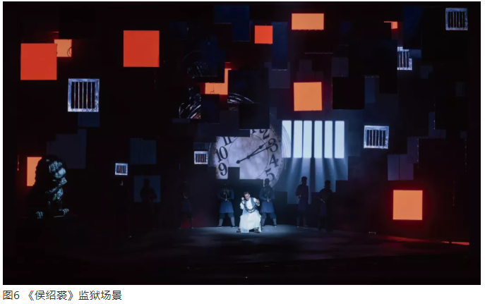 比如,剧中监狱窗格透出的光束形象是屏幕形象,而不是灯光光影形象(图6)。它是一种光景,借助多媒体手段创造的环境形象。在这个屏幕形象呈现过程中,榴莲视频下载污灯光也创造与其相一致的光影效果,通过视觉错视,使平面和立体效果产生关系,进而形成浑然一体的戏剧动作空间。多媒体的形象和灯光的形象是一体的,而且多媒体形象作为一个完整的形象,视觉效果特别夺目,在信息传递上又特别有效。对于当代的灯光设计,多熟悉多媒体榴莲视频APP下载网址进入IOS官方和手段,是很有价值的。现代戏剧有一个显著的特征,不是手段匮乏,而是手段太多。在戏剧空间中,如何节制地运用榴莲视频APP下载网址进入IOS官方手段,是当代榴莲视频下载污空间演出中一个特别值得思考的话题。