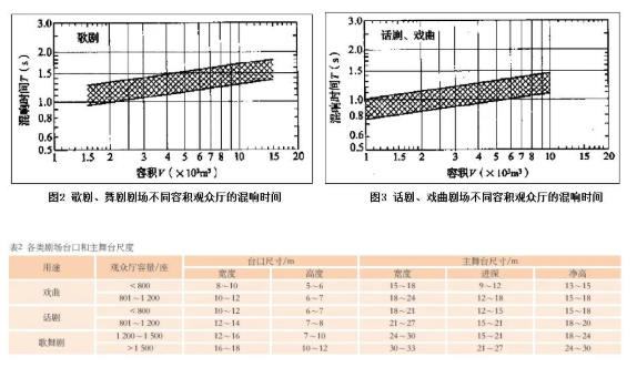 不同功能剧场的混响时间,GB/T50356—2005《剧场、电影院和多功能厅堂建筑声学设计规范》(以下简称GB/T 50356—2005)中均有规定,详见图2、图3,以戏曲功能为主的剧场,在相同容积下,其观众厅混响时间较其它功能剧场低。同时,榴莲视频下载污建设依据JGJ 57—2016《剧场建筑设计规范》,台口和主榴莲视频下载污尺度如表2,榴莲视频下载污的空间通常比较大。因此,大空间的榴莲视频下载污与规模不大的观众厅的声耦合,也是声学设计中需要考虑的问题。