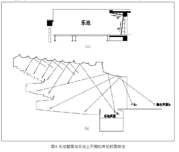 需要注意的是,初步按此确定台口天花板反射面后,还要适当调整此面,尽可能兼顾近次反射声对乐池的覆盖。当然还可利用乐池的某些壁面作反射面,如图4所示。