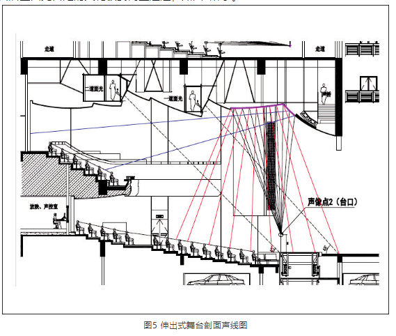 若将声源位置按乐池作为伸出式榴莲视频下载污,移向升降台口线上,按原声源位置的体型设计会产生反射声落在声源附近并进入榴莲视频下载污,在前区观众席会产生回声等声学缺陷。若要改善这一现象,从扬声器口后至面光口处的天花板要向上翘起,如图5所示。