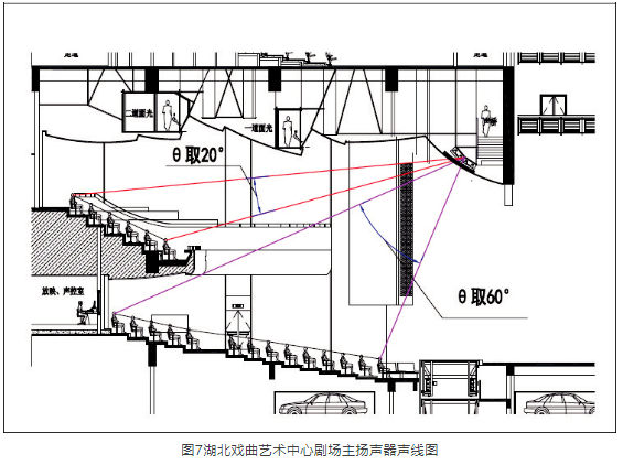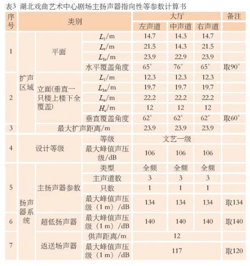 湖北戏曲艺术中心剧场扩声主扬声器声线图如图7所示。依据上述理论设计扬声器系统,计算过程及结果如表3所示,包括扬声器的垂直方向角、水平方向角和最大声压级等参数的选取。