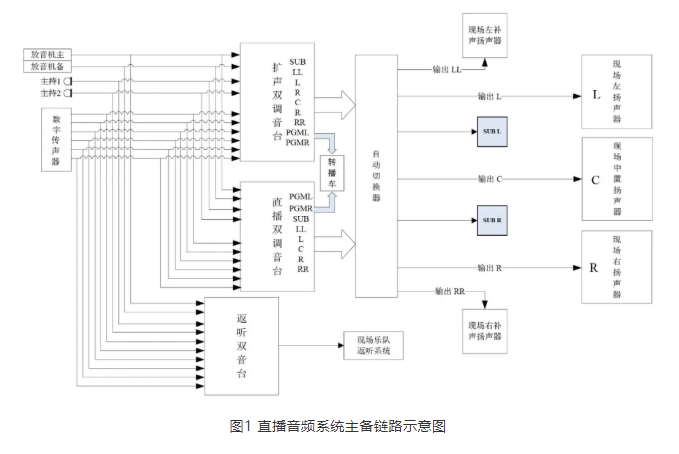 对于综艺节目的音频系统,现场扩声系统与播出系统的前级十分类似,主要涉及输入信号和调音台的备份,而现场扩声系统在后级设备的备份上较为复杂,通常会将主备调音台系统的输出信号在功率放大器或扬声器处进行切换。