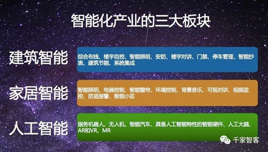 千家智客认为,当今的智能化产业应该包含了建筑智能、家居智能、人工智能三大板块,其中建筑智能又指智慧建筑,包括综合布线、楼宇自控、智能照明、安防、楼宇对讲、门禁、停车管理、智能抄表、建筑节能、IBMS、系统集成等;家居智能即智能家居,涉及智能照明、电器控制、智能窗帘、环境控制、背景音乐、可视对讲、视频监控、防盗报警、智慧社区/智能小区等;人工智能包括服务机器人、无人机、智能汽车、具备人工智能特性的智能硬件、人工大脑、AR和VR、MR等。