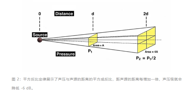 平方反比定律告诉榴莲视频下载污,如果没有回声或混响,距声源的距离每增加一倍,声压就会出现 6 dB 的下降。如图 2 所示,假设榴莲视频下载污在某个参考距离“d”处测量连续音频源的声压级并检测 SPL 值 p1。现在,如果榴莲视频下载污移动到两倍“d”的距离,榴莲视频下载污将检测到一个新的压力值 p2,它将是 p1 的二分之一。这个过程可以无限期地进行,距离每增加一倍,声压就会减半。