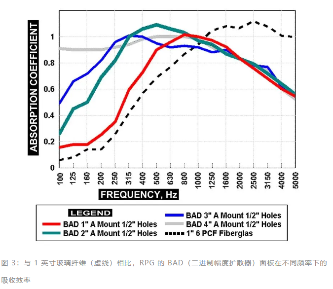 虽然有一些高 Q(窄带)吸收器可用(可以像参数/陷波均衡器/滤波器一样),但事实上,自 1990 年代以来,当 RPG 的 BAD(二进制幅度扩散器)面板等产品出现时,这种低 Q 声学面板(有时也包含一些扩散特性)对于“轻量级”房间非常有效 —— 意思是用框架构件和石膏板建造的房间墙壁(与混凝土或石头建造的大型大厅相比)。