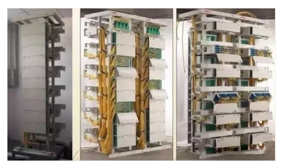 109. 配线架:电缆或光缆进行端接和连接的装置。在配线架上可进行互连或交接操作。