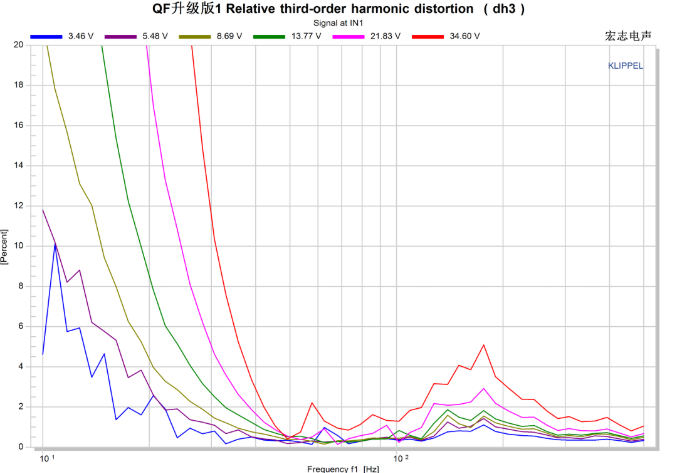 上图是一个喇叭的输入电压跟失真的关系图,不同颜色的线代表不同电压,可以看到,随着输入电压的增大,失真跟着增加。