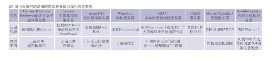 表1列出国内表演控制常用的媒体服务器名称和典型案例。