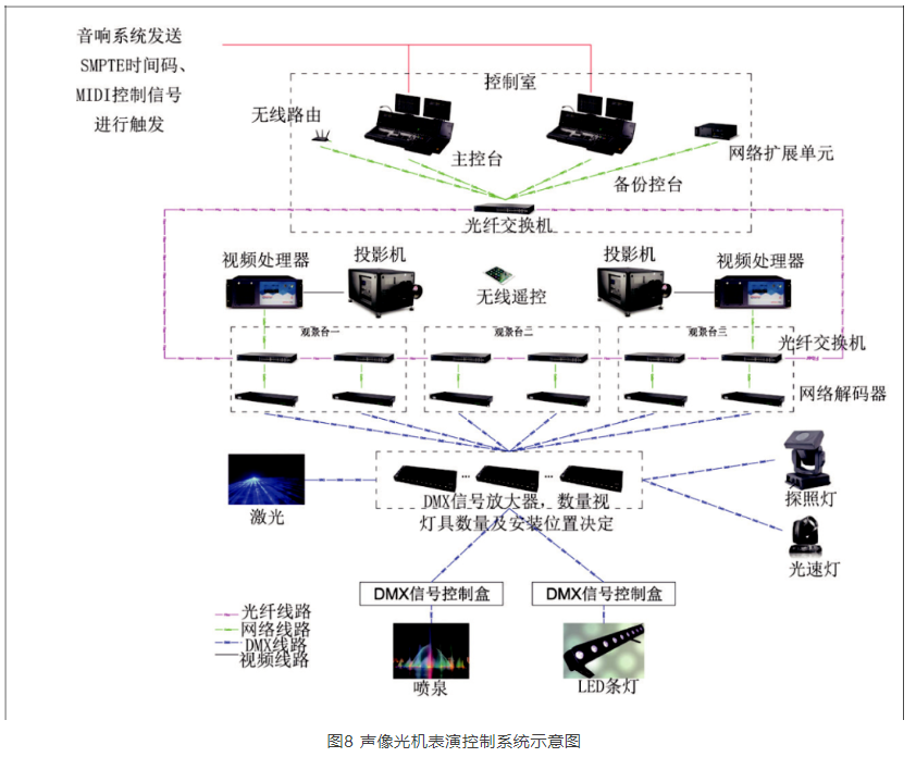 目前常用的声像光机表演控制系统以灯光音视频机械等各控台为中心、时间码为同步信号的方式,将灯光、音响、视频和机械跟随演出同步推进。本文主要分析采用运行DMX、MIDI、SMPTE等多种协议,控制常规灯具、电脑灯具、音响、投影、LED屏、喷泉、焰火、激光和机械(如冰屏或恐龙)动作等同步运行表演。该控制模式灵活可靠,有较广泛的应用。