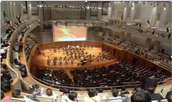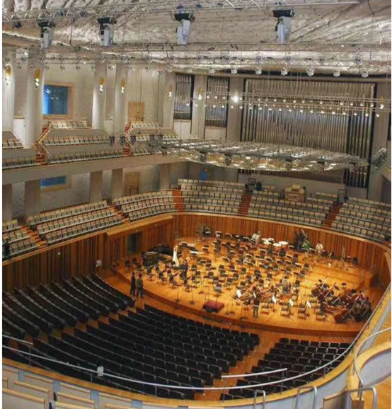 音乐厅榴莲视频下载污四周的墙面采用了与戏剧场类似的声学扩散墙,墙面有如站立起来的钢琴琴键,凸凹起伏、不规则排列。其凹凸的尺寸和形状经由数论精确计算得出,能扩散反射来自演奏台的声音,保障演出者良好的自我听闻和相互听闻,有利于乐队更好地发挥表演水平。音乐厅的侧墙则采用与天花板类似的声扩散装饰板,墙壁表面轻微凹凸的效果同样经过特殊设计。通过这些凹凸不平的纹理,能将声音均匀地扩散反射至音乐厅空间内的每个角落。在这些量身设计的综合作用下,音乐厅的混响时间可以达到2.2秒的优质音效。