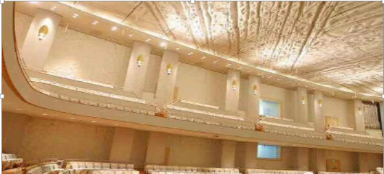 音乐厅的天花板形状不规则的白色浮雕像一片起伏的沙丘。天花板上看似凌乱的沟槽实际上经过了特别的声学设计,使声音能够被扩散反射,更加均匀、柔和。精美的天花板其实是特制的声扩散装饰板。天花板使用纤维石膏成型板制成,材质厚重,能够有效地防止低频吸收,增强厅内的低频混响时间,使低音效果(如管风琴、大管、大提琴等)更加具有震撼力和感染力。为达到声效的完美,在顶棚的下面还悬挂了一面龟背形状的集中式反声板,俗称“龟背反声板”,它的作用是将声音向四面八方散射。