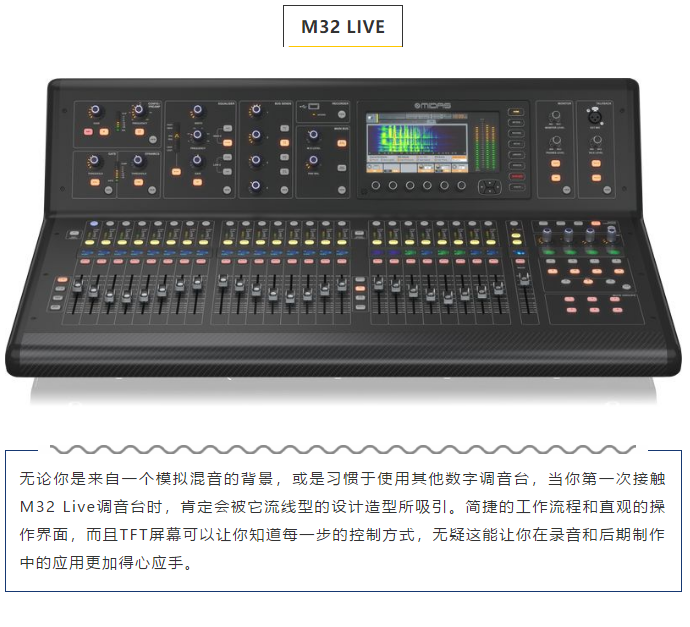 调音台方面,使用了现场主控数字调音台,英国知名调音台MIDAS的产品。M32作为主数字调音台。能够带来“采样率同步”音频质量,操作人员可以置身于舒适的环境里操作调音台。还有直观又易于驾驭的用户界面。