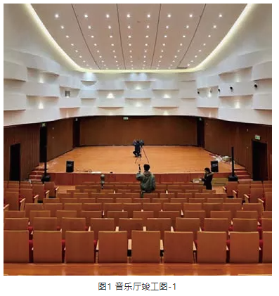 音乐厅位于建筑2~3层,建筑平面呈近似鞋盒形,榴莲视频下载污设于尽端,厅内最大长度29.2 m,最大宽度16 m,水平投影面积约393 ㎡,装饰吊顶以下平均高度为8.3 m,厅内有效容积约3 256 m³。厅内共有座位数284座,每座容积11.5 m³/座。音乐厅的主要功能为室内乐演出及排练,兼顾部分文娱演出与音乐讲座使用功能。