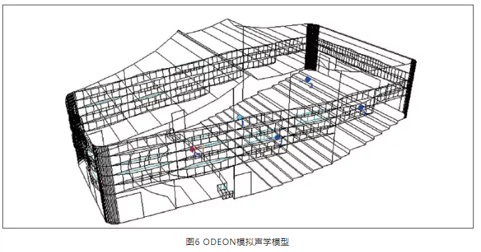 为验证声学设计的合理性与科学性,对音乐厅进行三维建模与音质模拟(图6),通过仿真计算,预测厅内各项音质指标是否满足设计要求。此外,为进一步将音质指标“可听化”,在设计过程中,将仿真计算得到的脉冲响应与消声室内录制得到的音频信号进行卷积,预制音乐厅建成后的音频信号,然后借助多声道还声系统建立“虚拟声场”,让听者在音乐厅建成之前切身感受其音质效果。本项目利用的是8.1通道还声系统,可基本正确反映直达声与早期反射声的方位。
